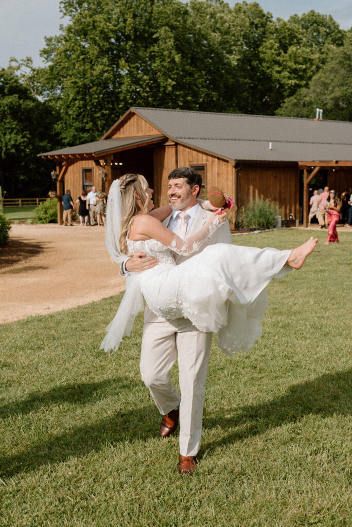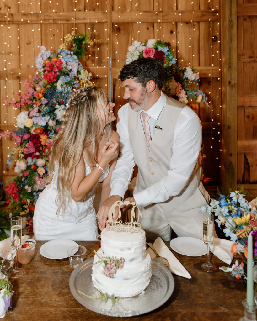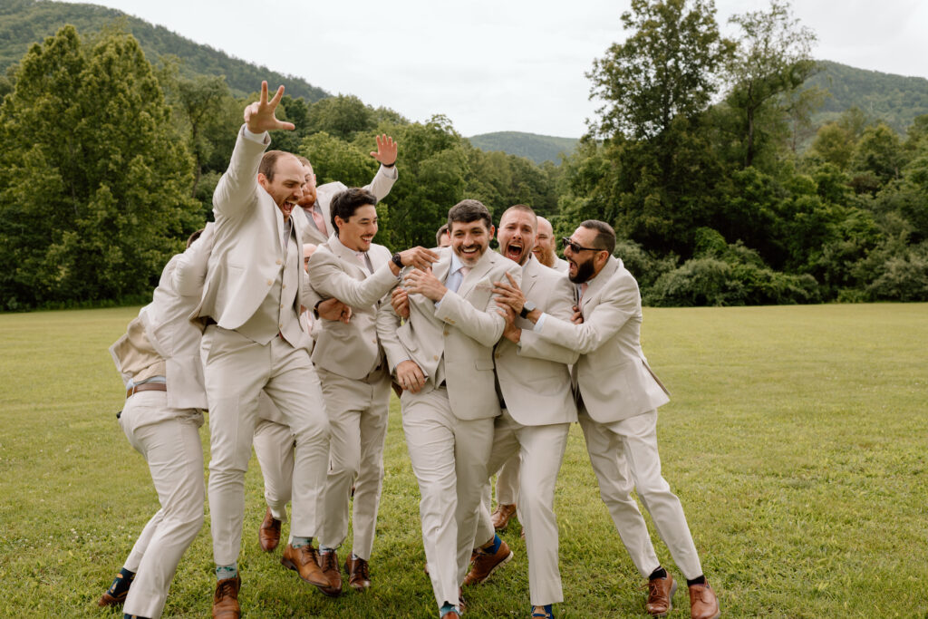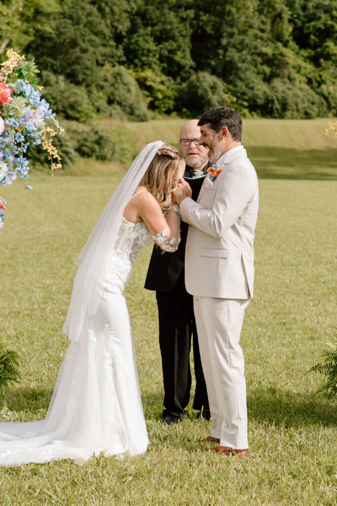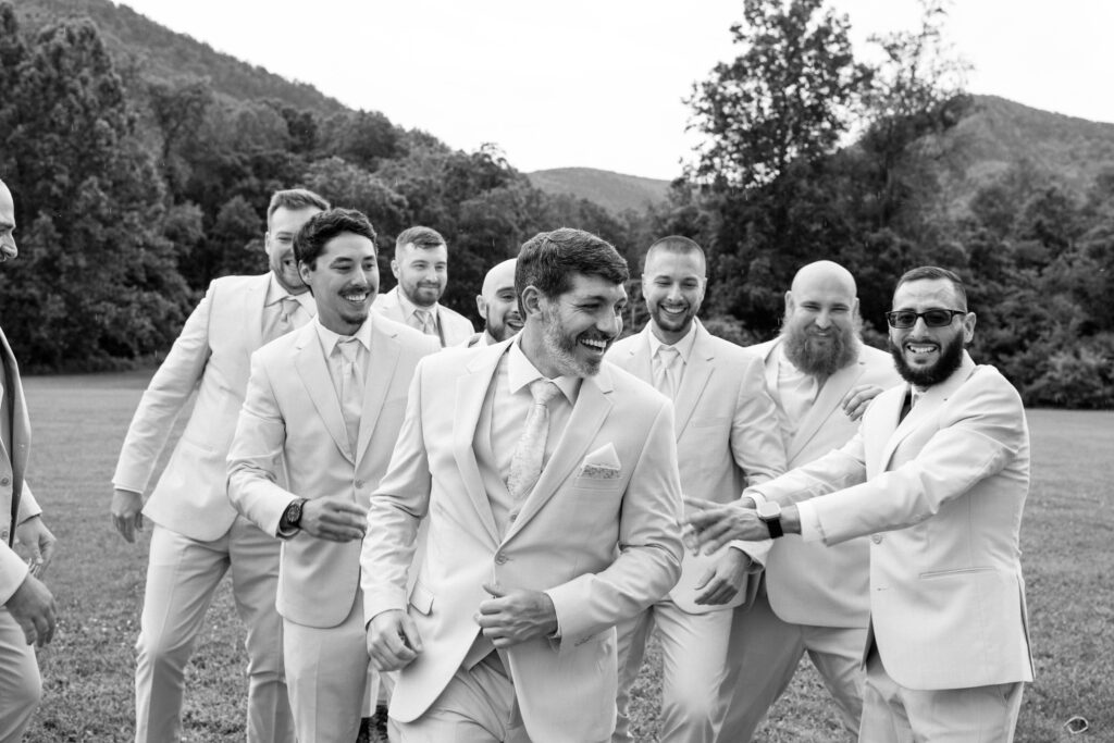 Balcony Downs Venue offers multiple locations to say your I dos, but in front of the beautiful mountain views is one of the most popular spots for a good reason. This location on the grounds allows for the wedding party to make their entrance from the reception barn, making for a dramatic walk for the bride down the aisle. The couple chose to wait for the ceremony to see each other so Ryan’s reaction below is authentic and so sweet. You wouldn’t even know it was pouring rain just 20 minutes before this ceremony!