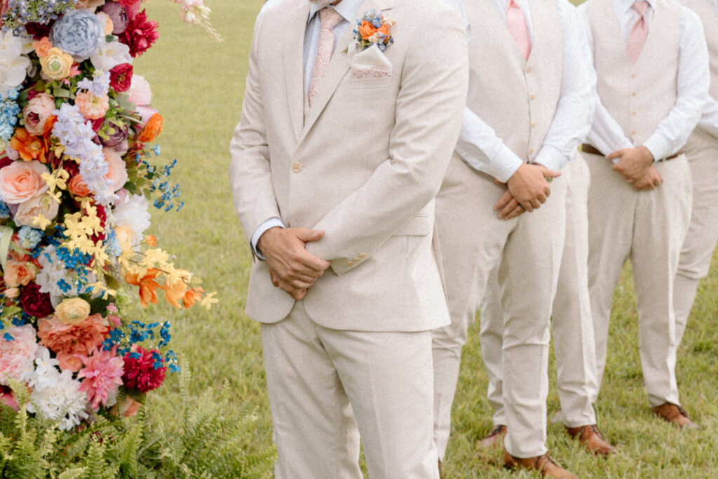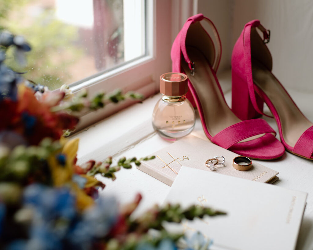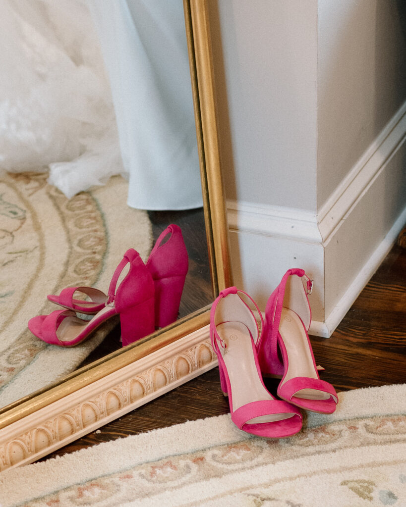 The details and florals of this summer wedding needed its own section because the colors all came together so beautifully. The bridesmaids all wore different styles of dresses with various shades of pink and florals to match the garden party theme. I also loved how the bride wore hot pink wedding shoes that matched the mother of the bride’s dress. The groom’s tie and pocket square had dainty pink florals to pull it all together.