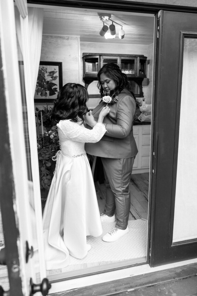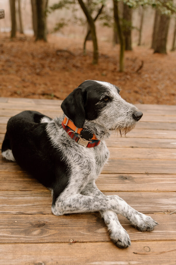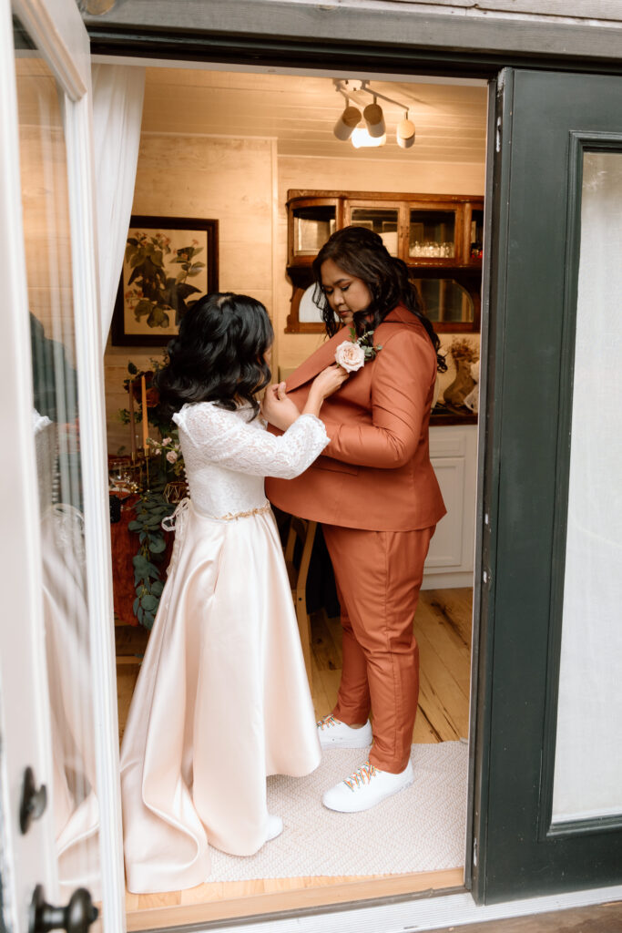 Kris and Gail got their hair and makeup done together in their tiny cabin. The Airbnb was tucked in the woods overlooking a beautiful pond. When we arrived to start their elopement photography, we were greeted with a herd of goats and the property dog host, Buddy.