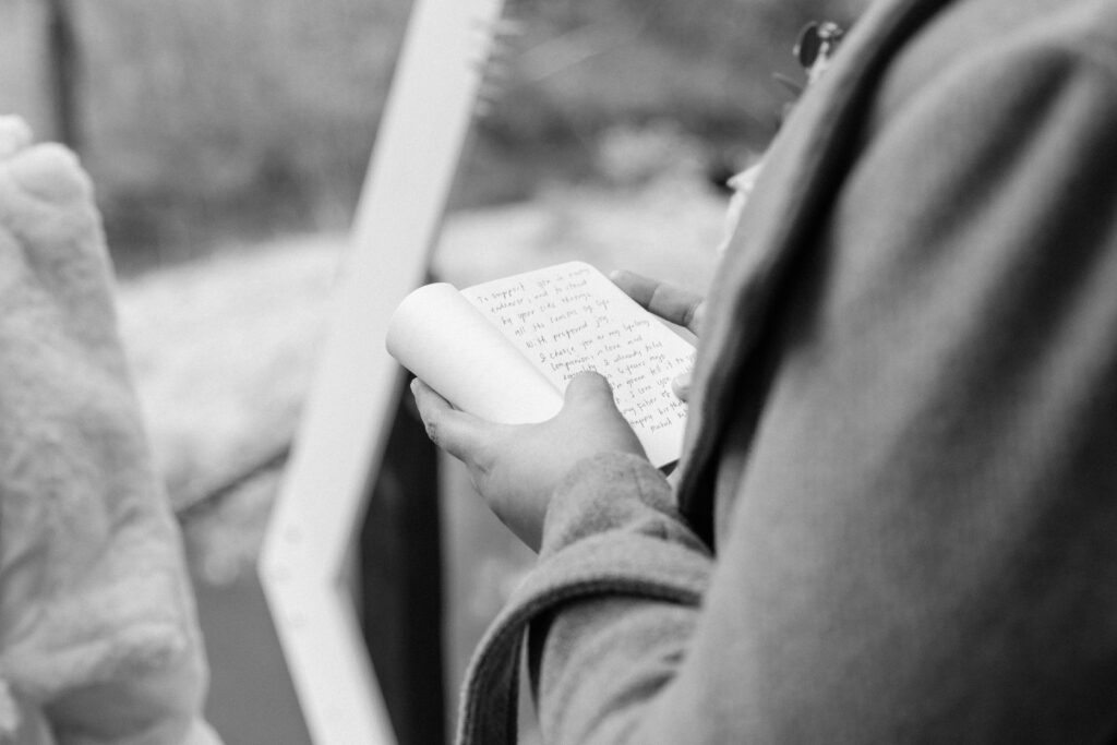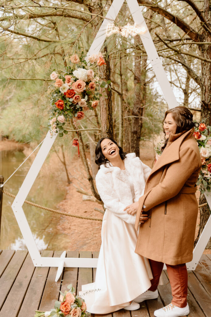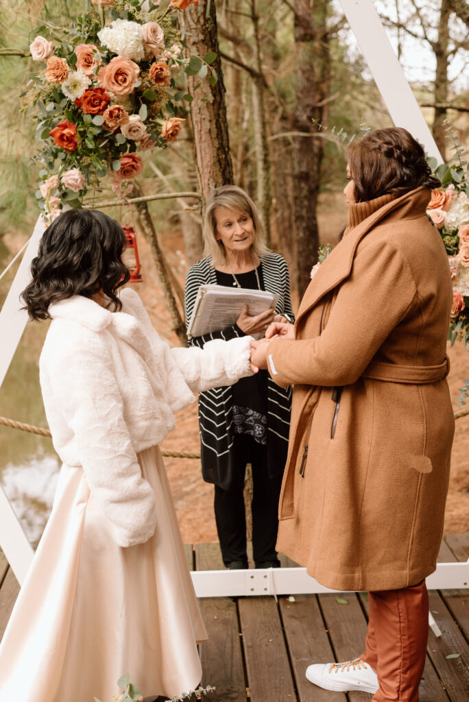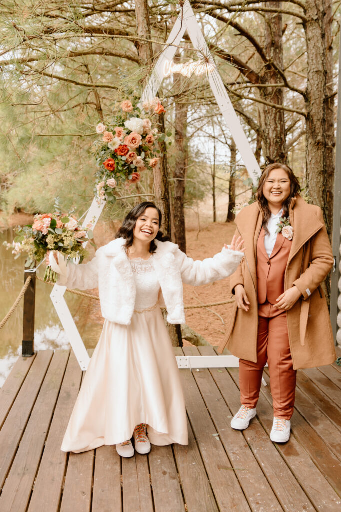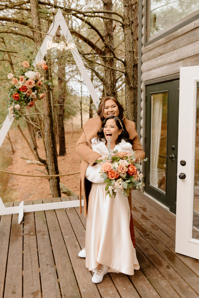 The couple chose the back of the cabin to have their ceremony. The deck overlooked the pond and made for the perfect spot to put up their boho wedding arch with their retro neon sign. The couple decided to share personal handwritten vows that were written in these personalized books that matched their vintage theme so well.