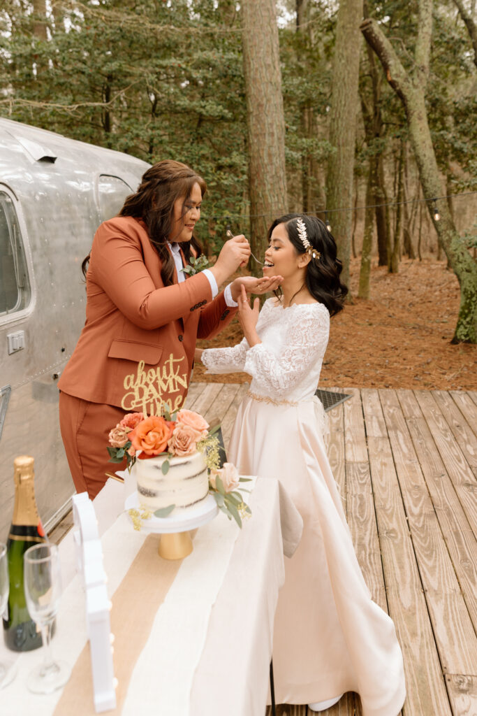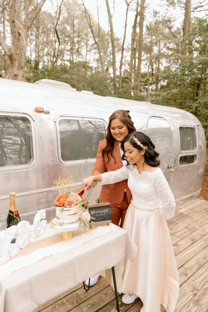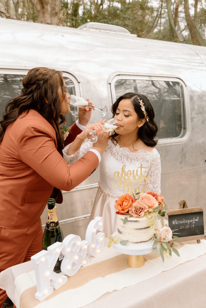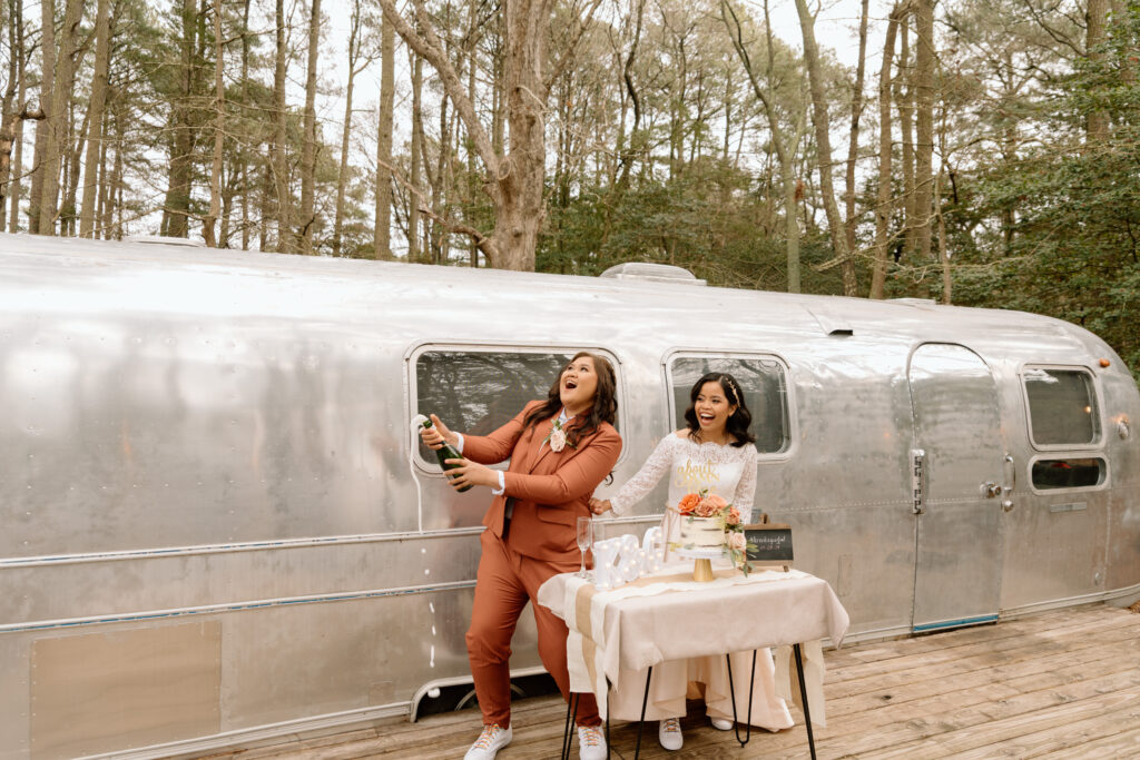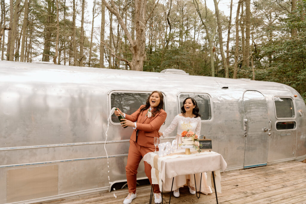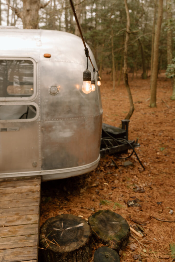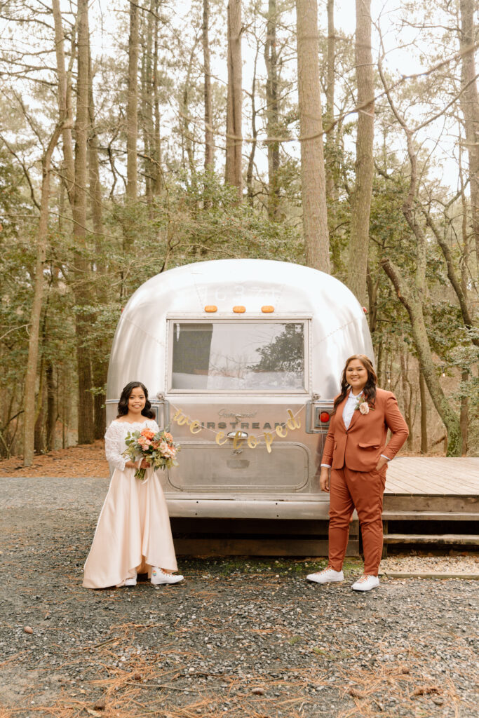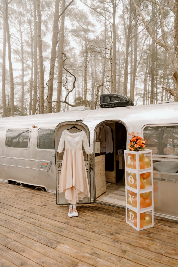 After they got their hair and makeup done, we walked over to the Airstream so that they could get in their wedding attire before the ceremony back at the cabin.